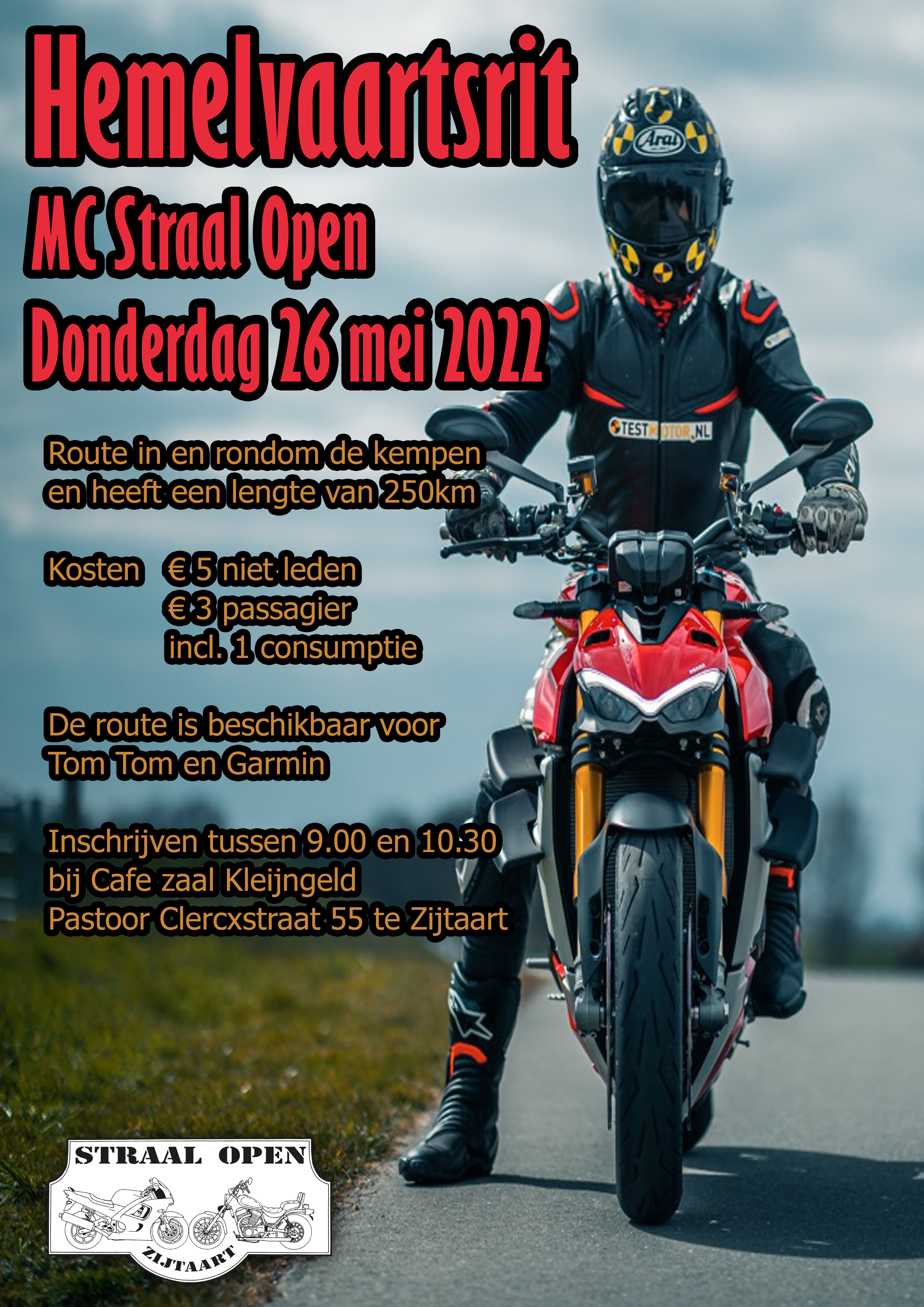Zondag 4 mei 2025 "Openrit MC Olland", inschrijven vanaf 09.00 uur, locatie café De Beuk. Kosten leden/SMC-leden 6 euro en niet leden 7,50 euro (incl. consumptie).